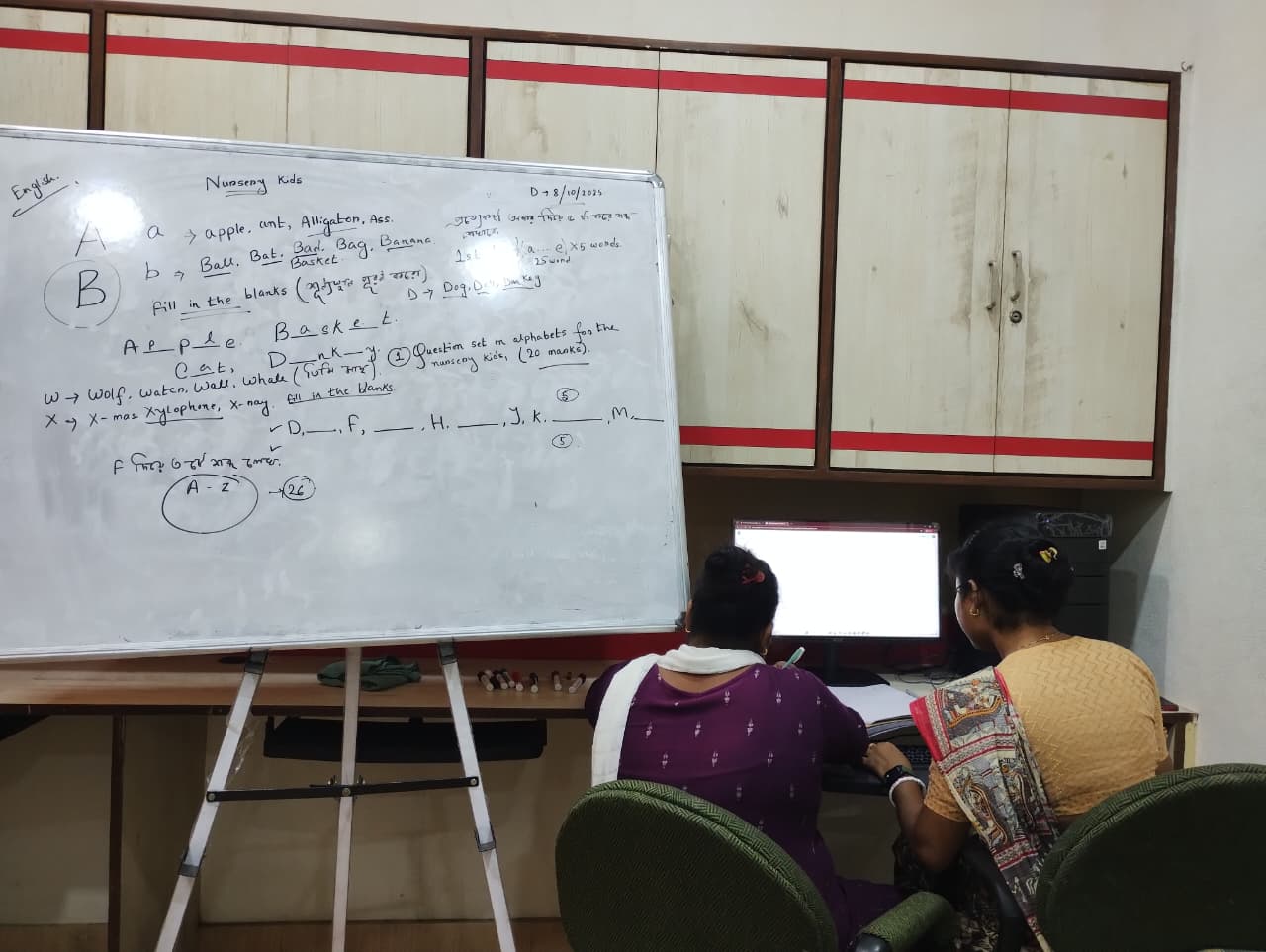 The teachers also practised question-making for nursery-level tests, inspired by the sample worksheets. These included short exercises such as filling in blanks, matching, counting, and spelling.